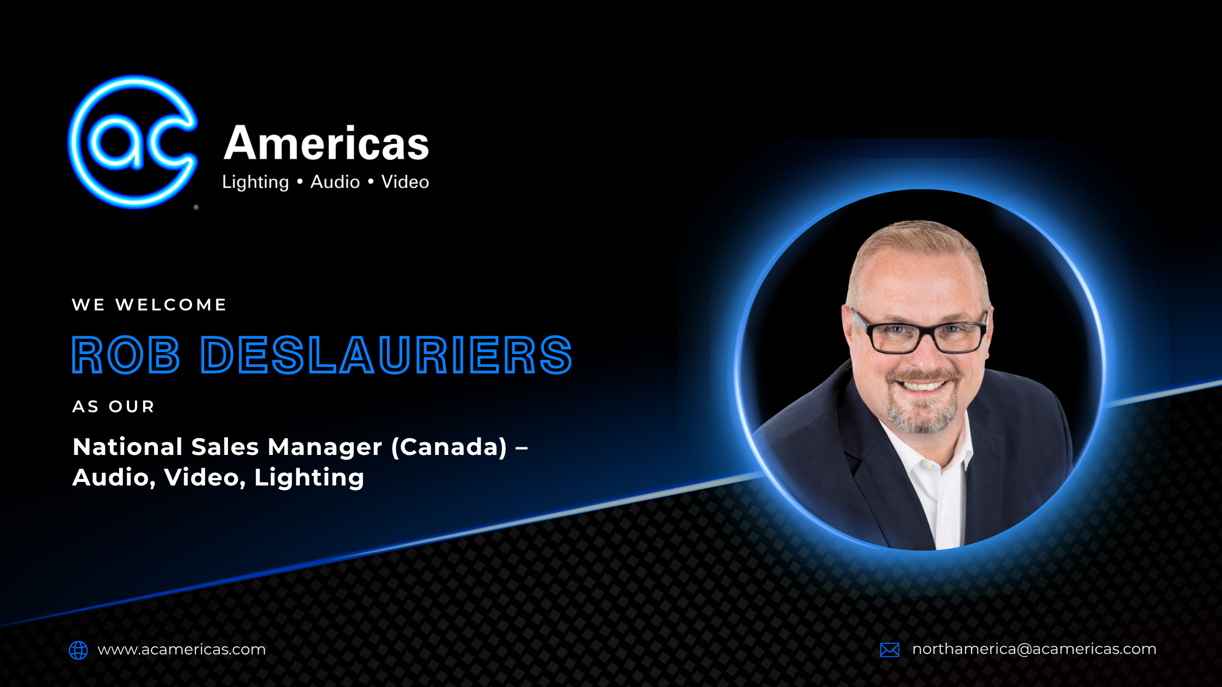 A.C. Americas (Canada) Ltd., your North American distributor of world-class lighting, audio, and video products, is pleased to announce the appointment of Rob Deslauriers as National Sales Manager (Canada) – Audio, Video, Lighting.