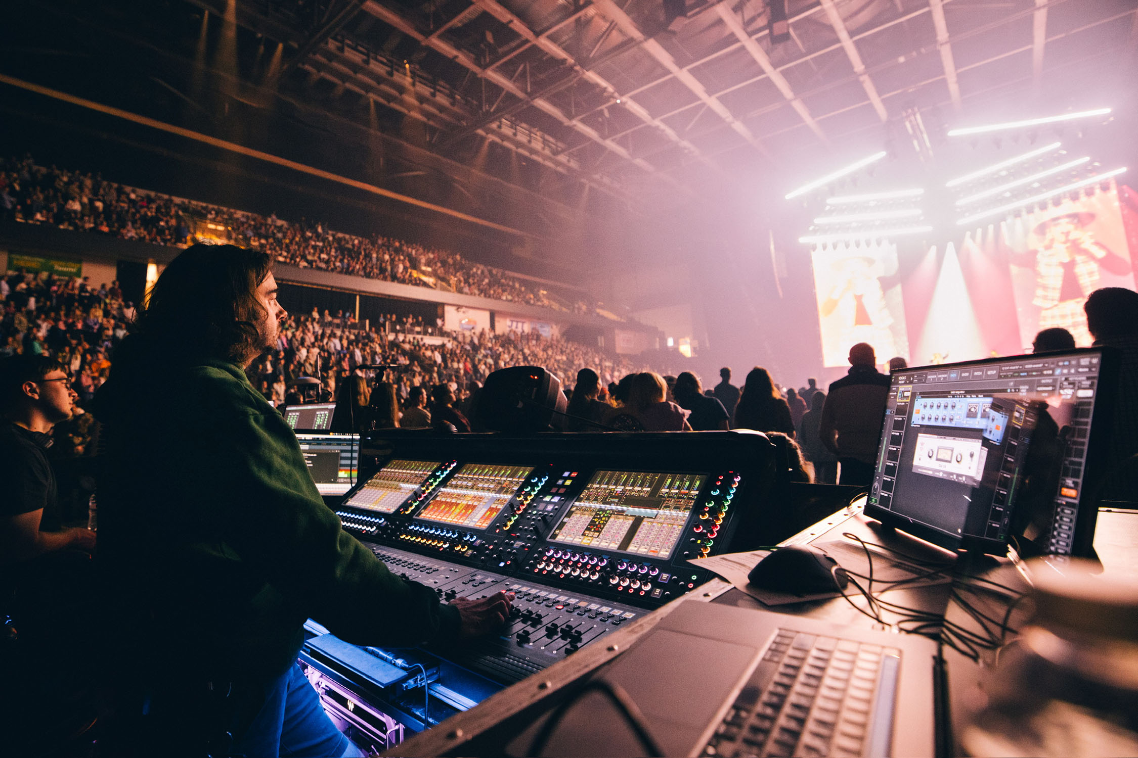“That’s been huge for me,” says Snyder, who is also in charge of maintaining gain-sharing between the consoles and racks. “Phil used to tour with two outboard PSEs and we would always try our best to advance them for one-off gigs. Having that in the board now is awesome. I mixed a pretty gnarly sounding room in January and had that MSE across all of my vocals and it saved the show in that environment. And that software upgrade for me at monitors has been a godsend, because I am in the console—I don’t have any outboard gear, and I’m not using Waves. So the more onboard tools that I can get, the better. And that one has definitely been heavily used by me and I love it.”